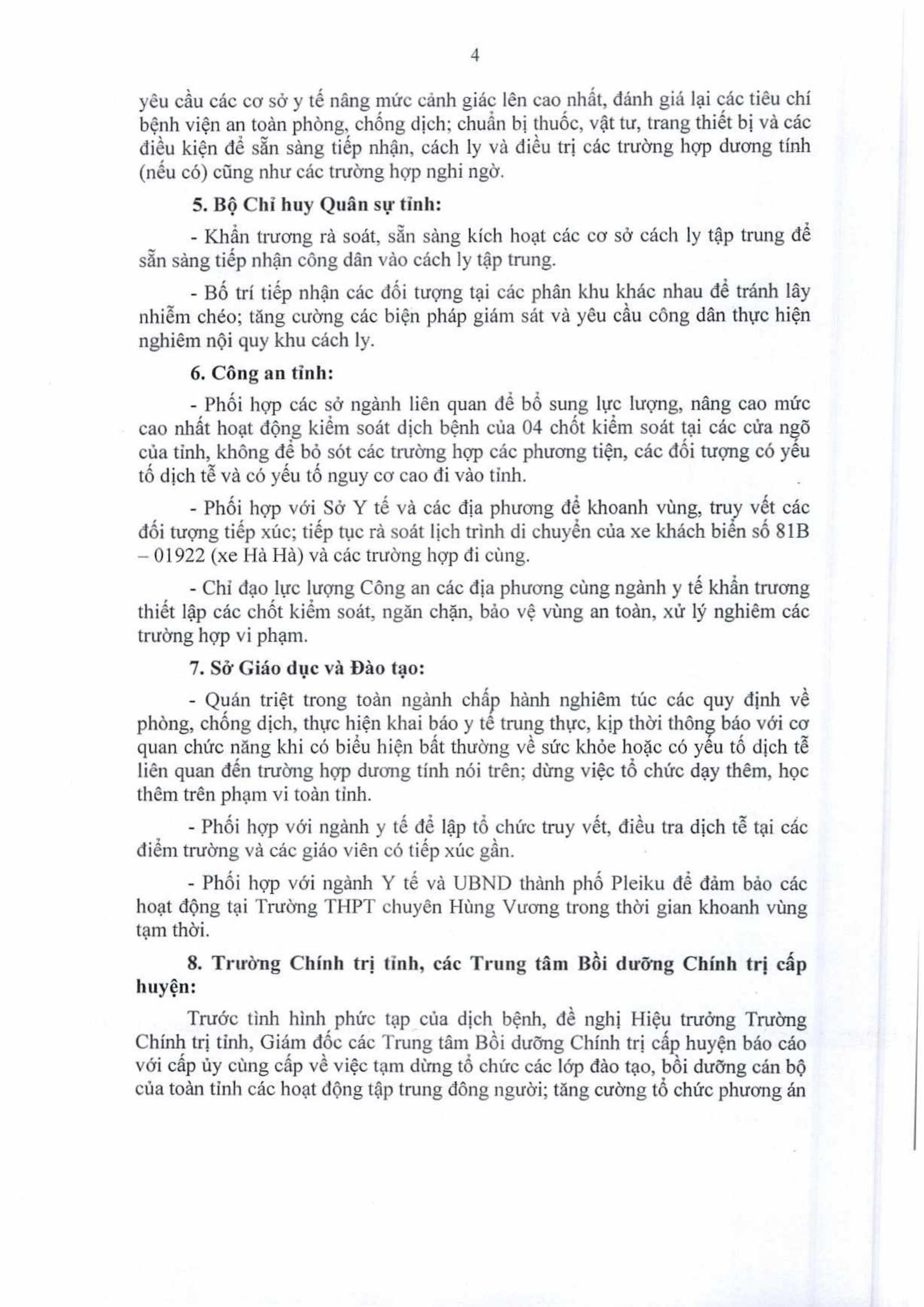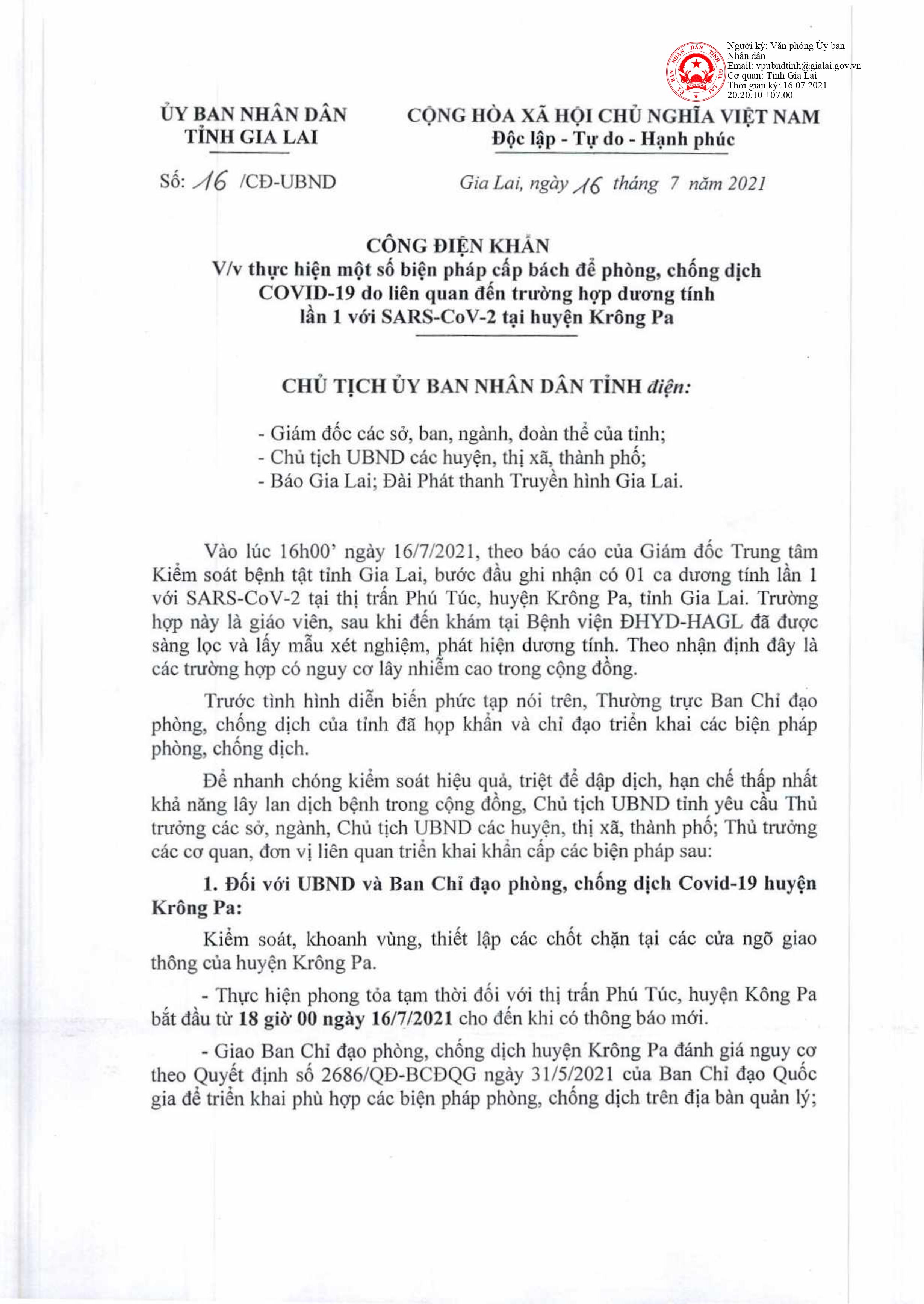 Về việc thực hiện một số biện pháp cấp bách để phòng, chống dịch Covid-19 do liên quan đến 1 trường hợp dương tính với SARS-CoV-2 tại huyện Krông Pa.