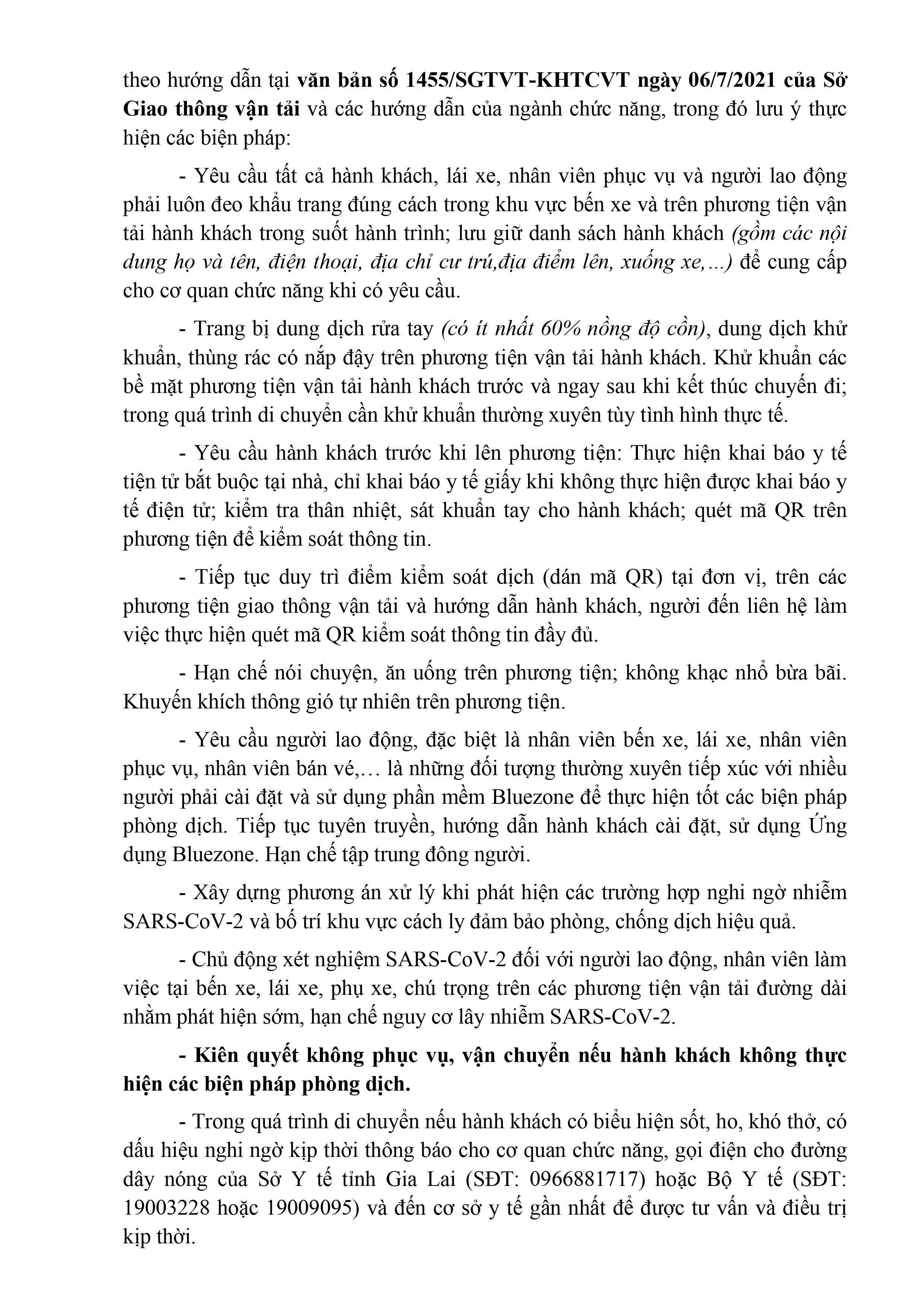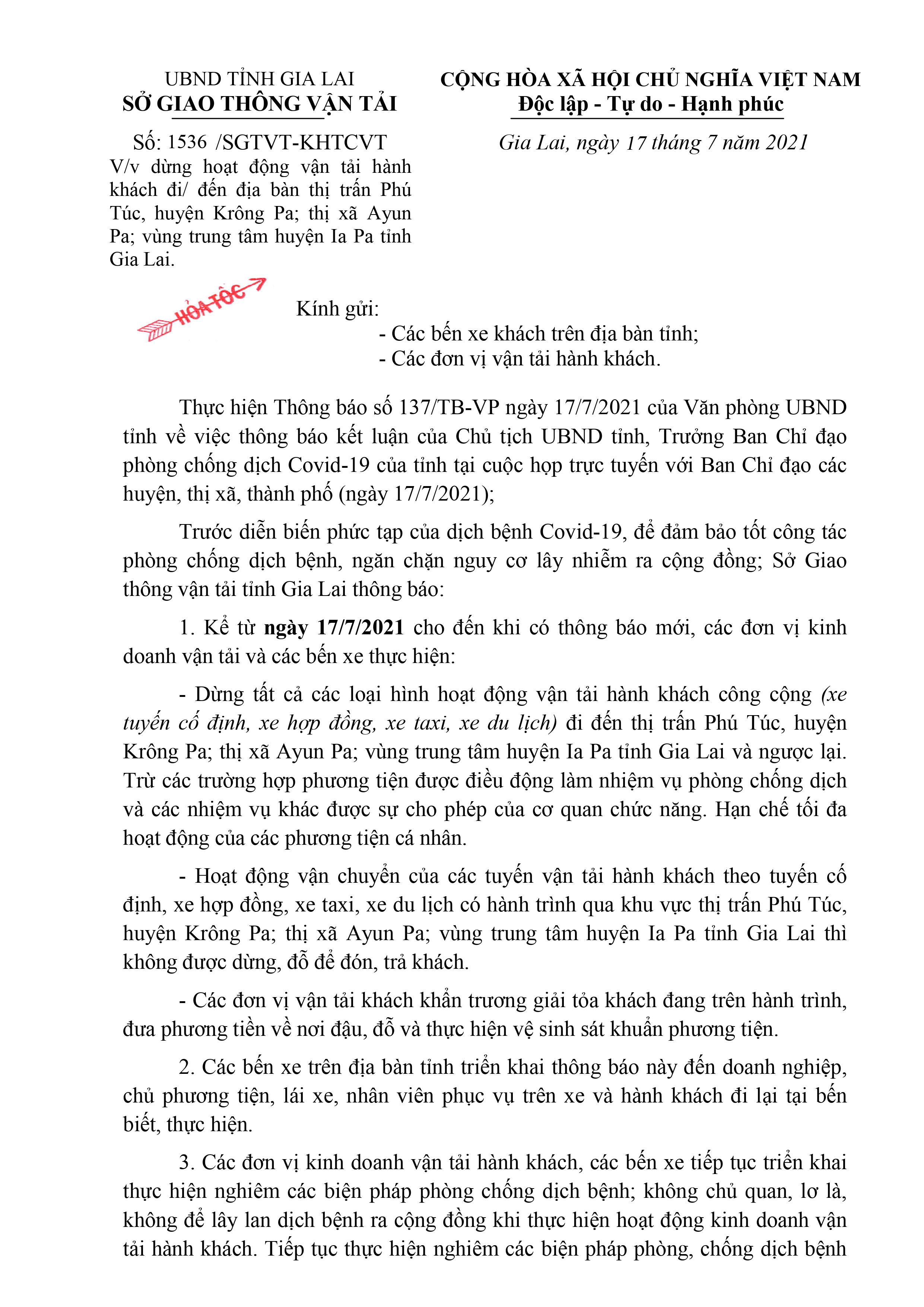 Về việc dừng hoạt vận tải hành khách đi/đến địa bàn thị trấn Phú Túc, huyện Krông Pa; thị xã AyunPa; vùng trung tâm huyện Ia Pa tỉnh Gia Lai.