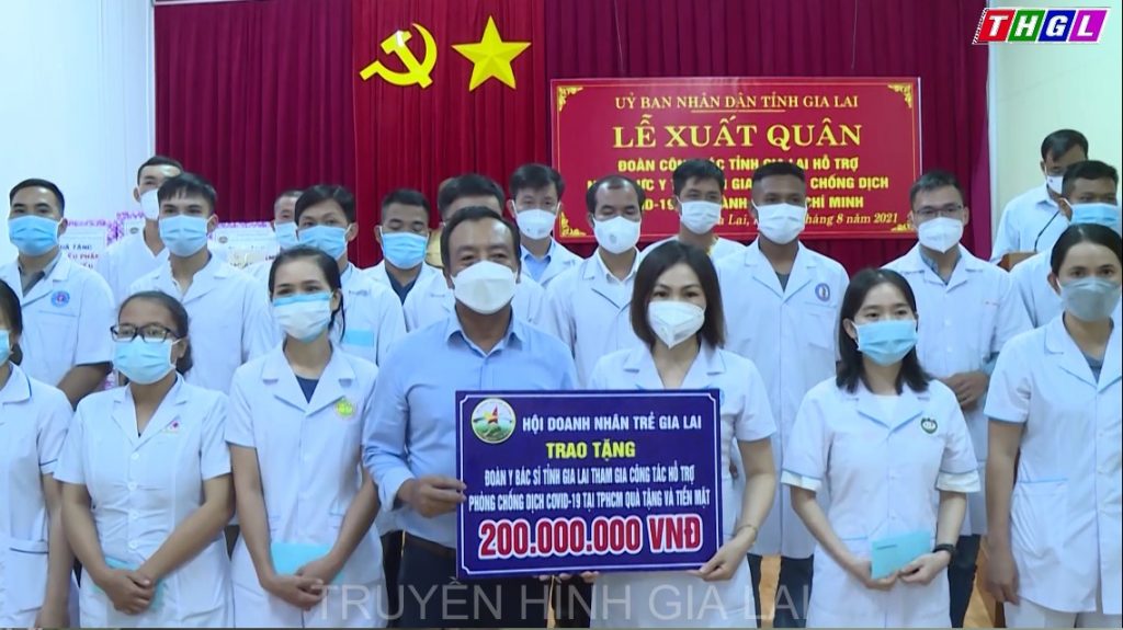 Cuối tháng 8 vừa qua, tại buổi lễ xuất quân của Đoàn công tác tỉnh Gia Lai hỗ trợ nhân lực y tế tham gia phòng-chống dịch Covid-19 tại TP. Hồ Chí Minh, Hội Doanh nhân trẻ tỉnh Gia Lai đã trao quà và tiền cho 21 thành viên Đoàn công tác với tổng trị giá hơn 200 triệu đồng. Đây là một trong những đợt trao quà của Hội Doanh nhân trẻ Gia Lai trong việc chung tay phòng chống dịch. Trong đợt bùng phát dịch thứ 4 này, các thành viên của Hội đã quyên góp quà và tiền hỗ trợ cho công tác phòng chống dịch của tỉnh và các tỉnh phía Nam với tổng số tiền hơn 5 tỷ đồng.