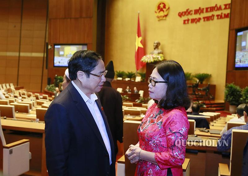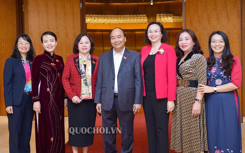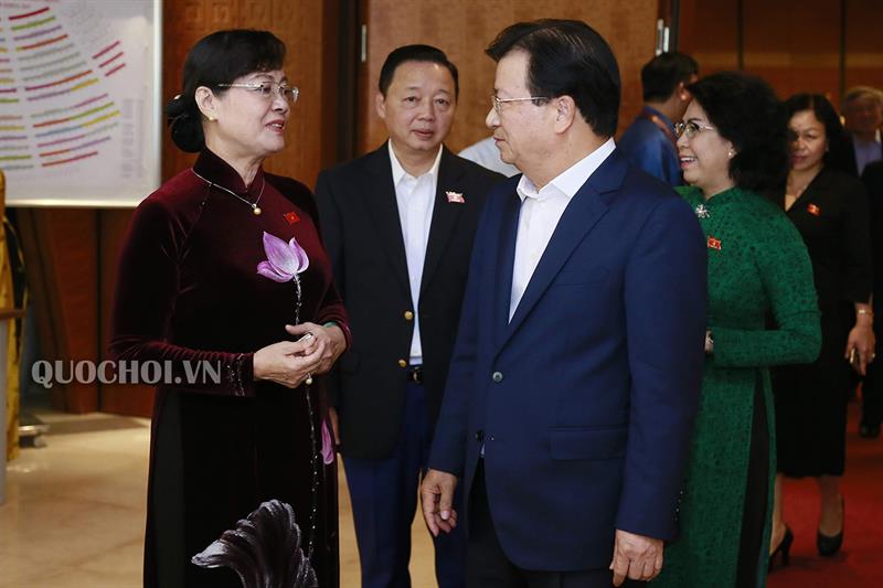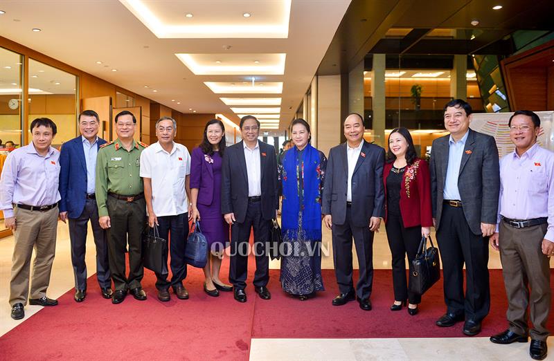 Chủ tịch Quốc hội Nguyễn Thị Kim Ngân, Thủ tướng Chính phủ Nguyễn Xuân Phúc cùng các đại biểu bên hành lang Quốc hội.