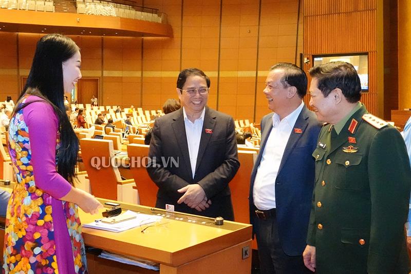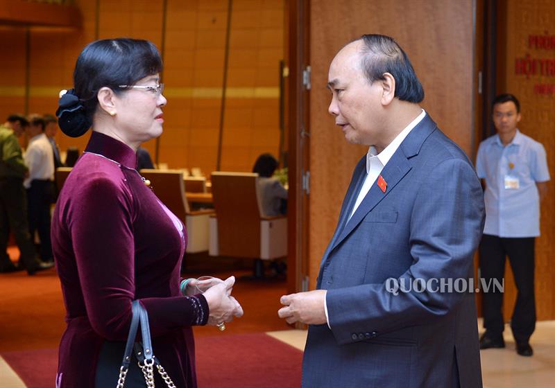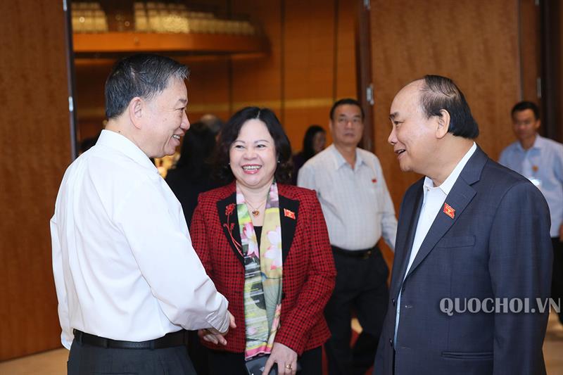 Thủ tướng Chính phủ Nguyễn Xuân Phúc trao đổi cùng các đại biểu Quốc hội bên lề phiên chất vấn.
