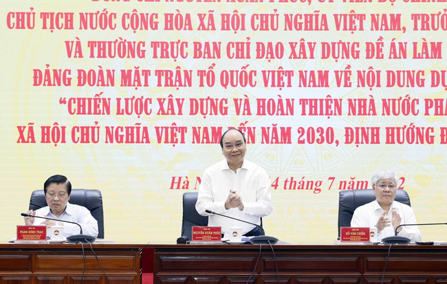 Sáng 14/7, tại Hà Nội, Chủ tịch nước Nguyễn Xuân Phúc, Trưởng Ban chỉ đạo xây dựng Đề án “Chiến lược xây dựng và hoàn thiện Nhà nước pháp quyền xã hội chủ nghĩa Việt Nam đến năm 2030, định hướng đến năm 2045” chủ trì buổi làm việc của Thường trực Ban Chỉ đạo với Đảng đoàn Mặt trận Tổ quốc Việt Nam.