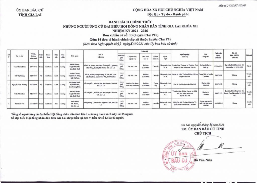 NGHỊ QUYẾT số 33 về việc lập và công bố danh sách chính thức những người ứng cử đại biểu Hội đồng nhân dân tỉnh Gia Lai khóa XII, nhiệm kỳ 2021 – 2026 theo từng đơn vị bầu cử tại 21 đơn vị bầu cử đã ấn định