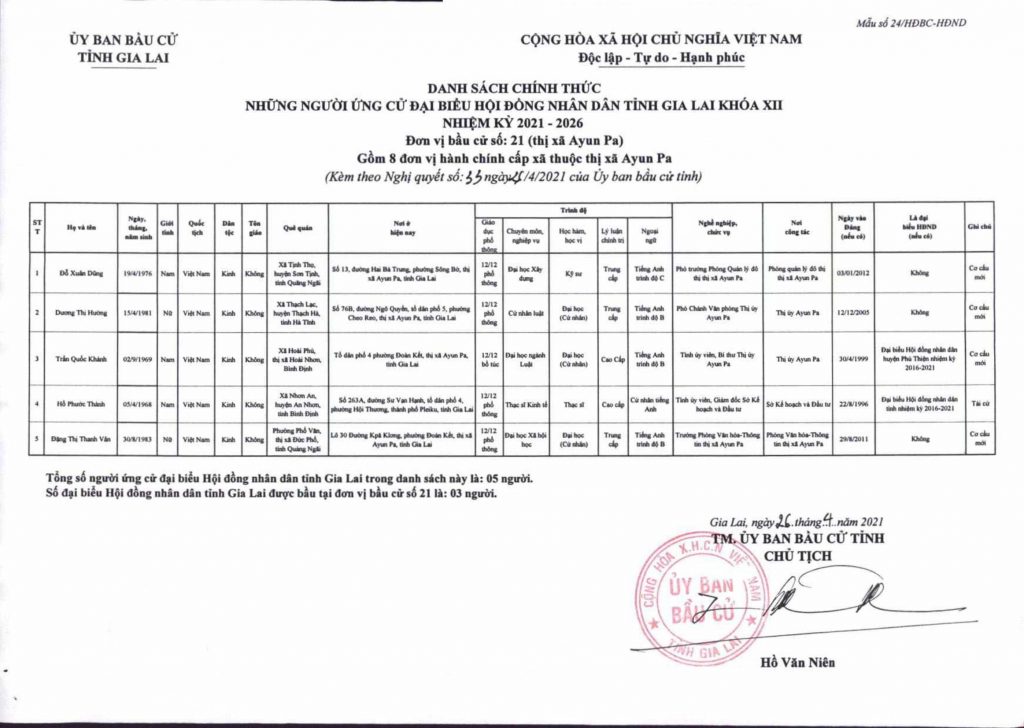 NGHỊ QUYẾT số 33 về việc lập và công bố danh sách chính thức những người ứng cử đại biểu Hội đồng nhân dân tỉnh Gia Lai khóa XII, nhiệm kỳ 2021 – 2026 theo từng đơn vị bầu cử tại 21 đơn vị bầu cử đã ấn định