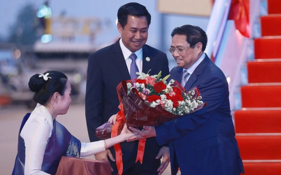 Thủ tướng Phạm Minh Chính và Đoàn cấp cao Chính phủ Việt Nam tới sân bay quốc tế Wattay, Thủ đô Vientiane, CHDCND Lào để dự Hội nghị cấp cao Ủy hội sông Mekong quốc tế lần thứ 4.