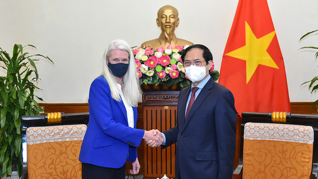 Tiếp xã giao Quốc vụ khanh Amanda Milling, Bộ trưởng Ngoại giao Bùi Thanh Sơn nhấn mạnh Việt Nam-Anh cần đẩy mạnh các hoạt động xúc tiến thương mại, đầu tư để tận dụng hiệu quả Hiệp định UKVFTA.