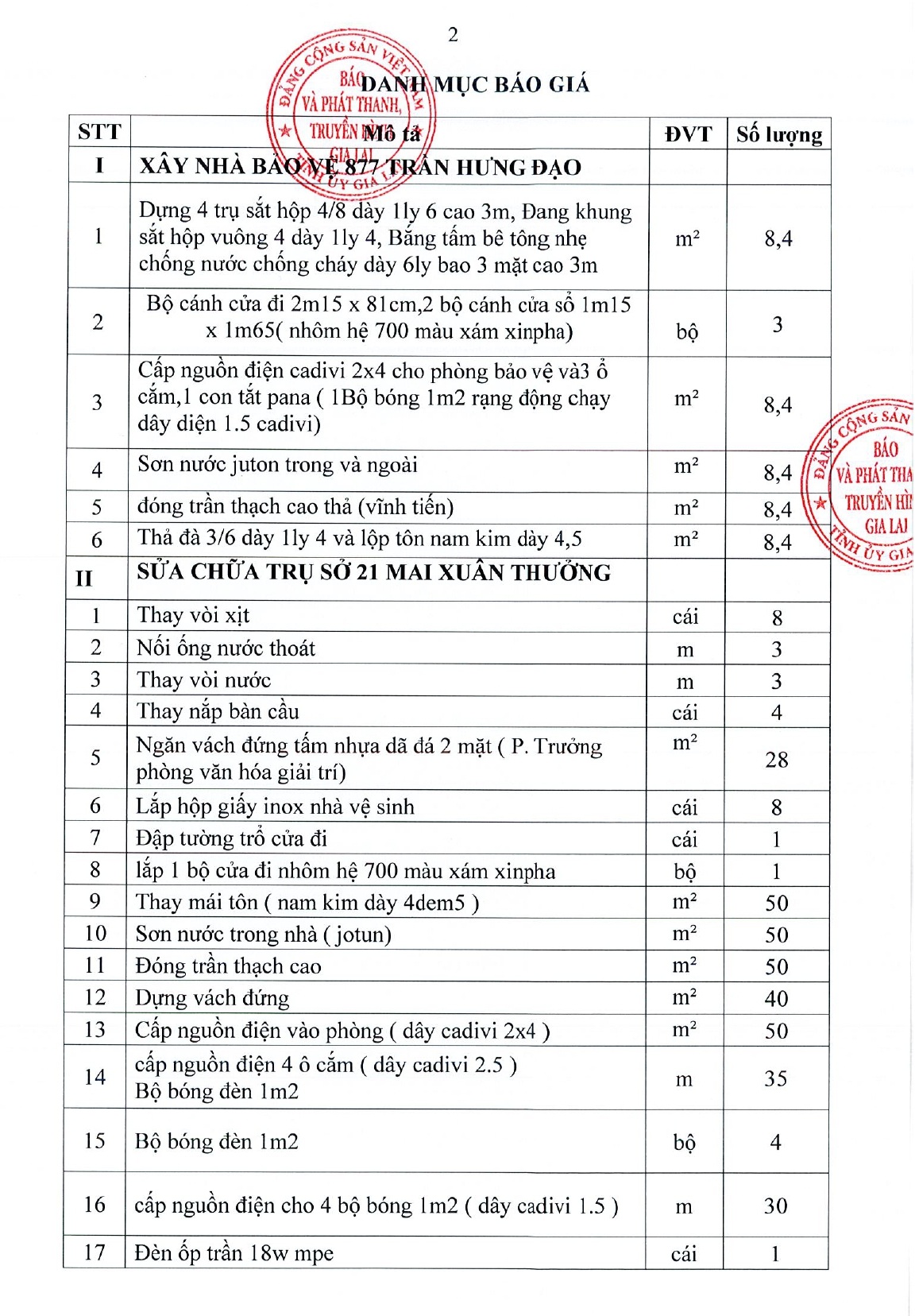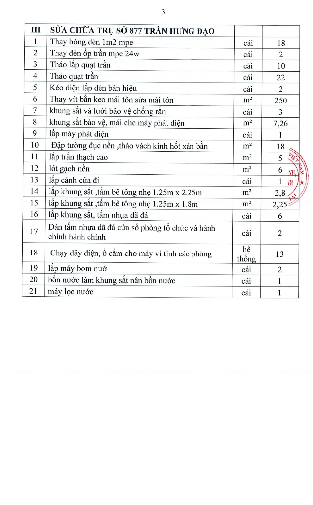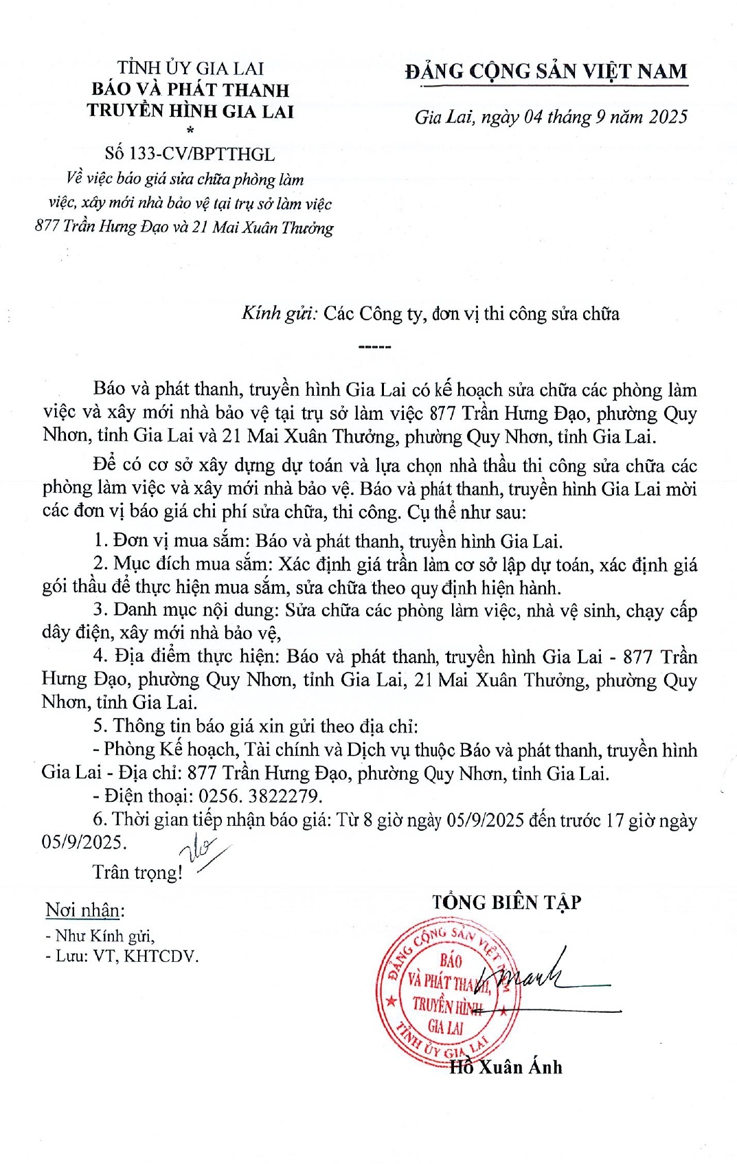 Công văn số 133 – Về việc báo giá sửa chữa phòng làm việc, xây mới nhà bảo vệ tại trụ sở làm việc 877 Trần Hưng Đạo và 21 Mai Xuân Thưởng