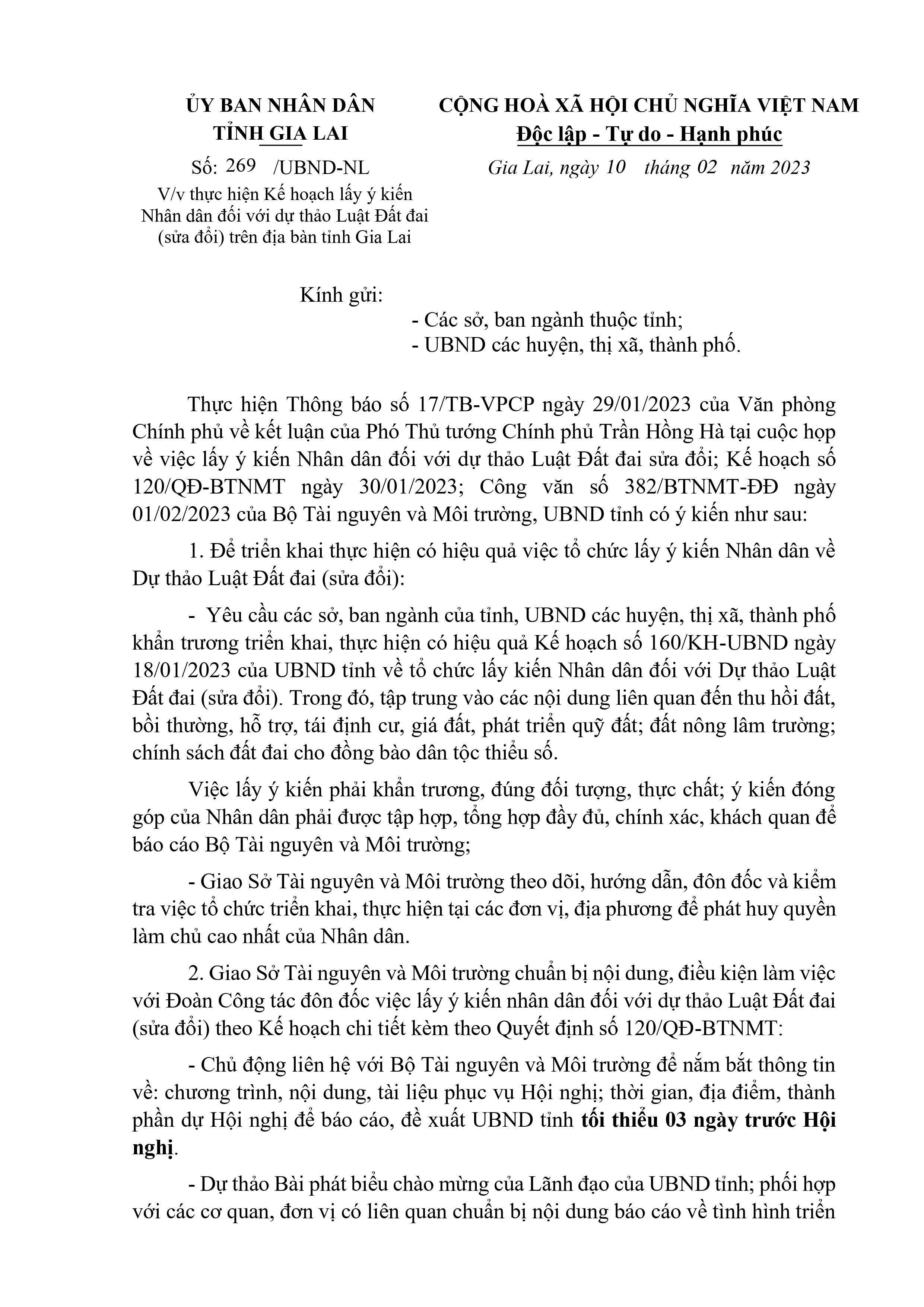 Về việc thực hiện Kế hoạch lấy ý kiến Nhân dân đối với dự thảo Luật đất đai sửa đổi trên địa bàn tỉnh Gia Lai