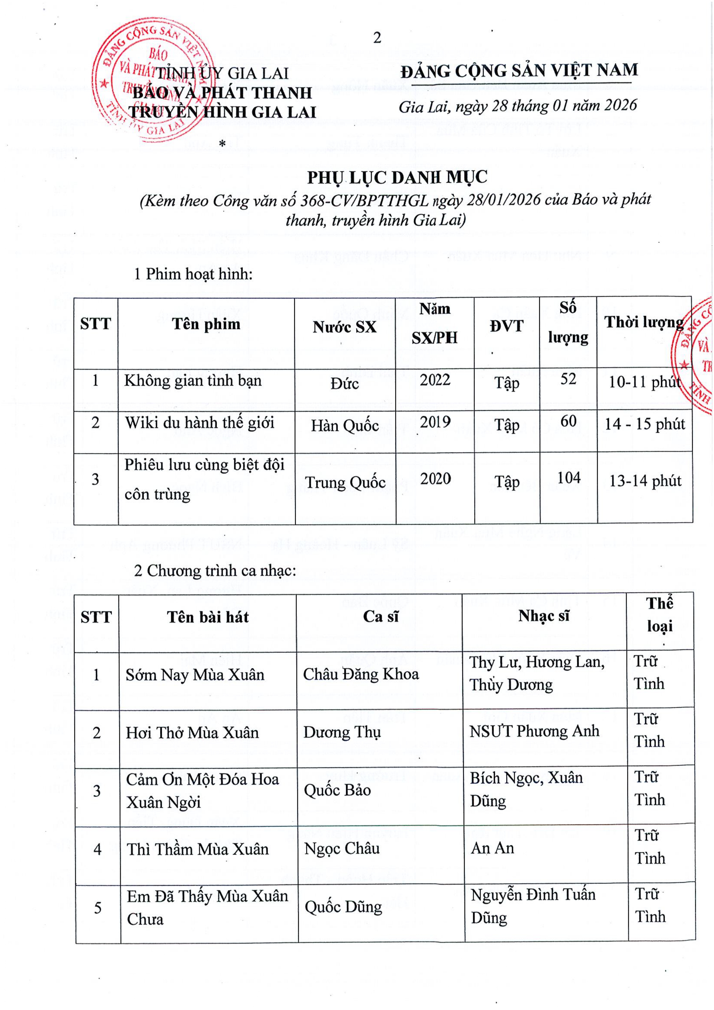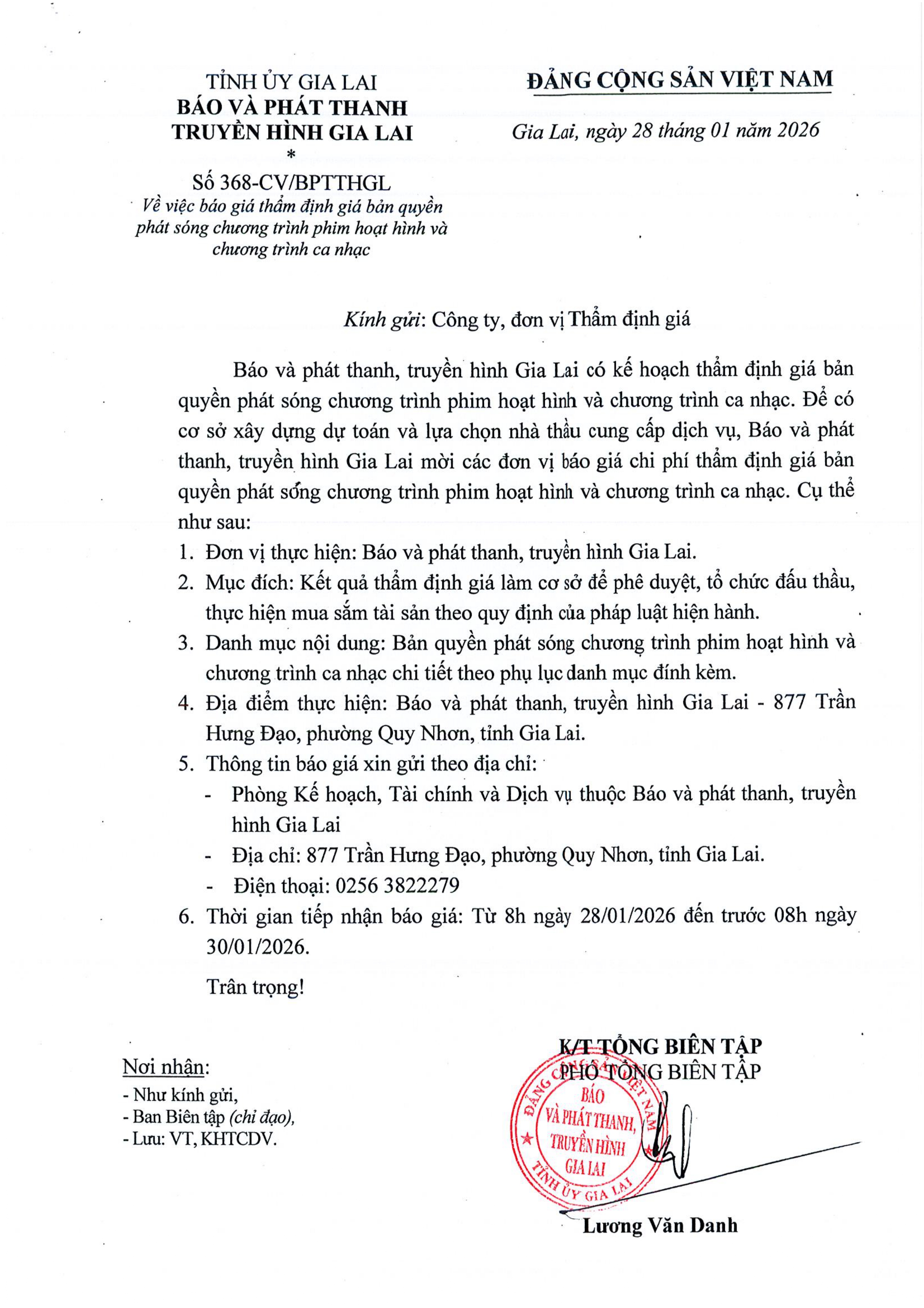 CÔNG VĂN Số 368 – Về việc báo giá thẩm định giá bản quyền phát sóng chương trình phim hoạt hình và chương trình ca nhạc
