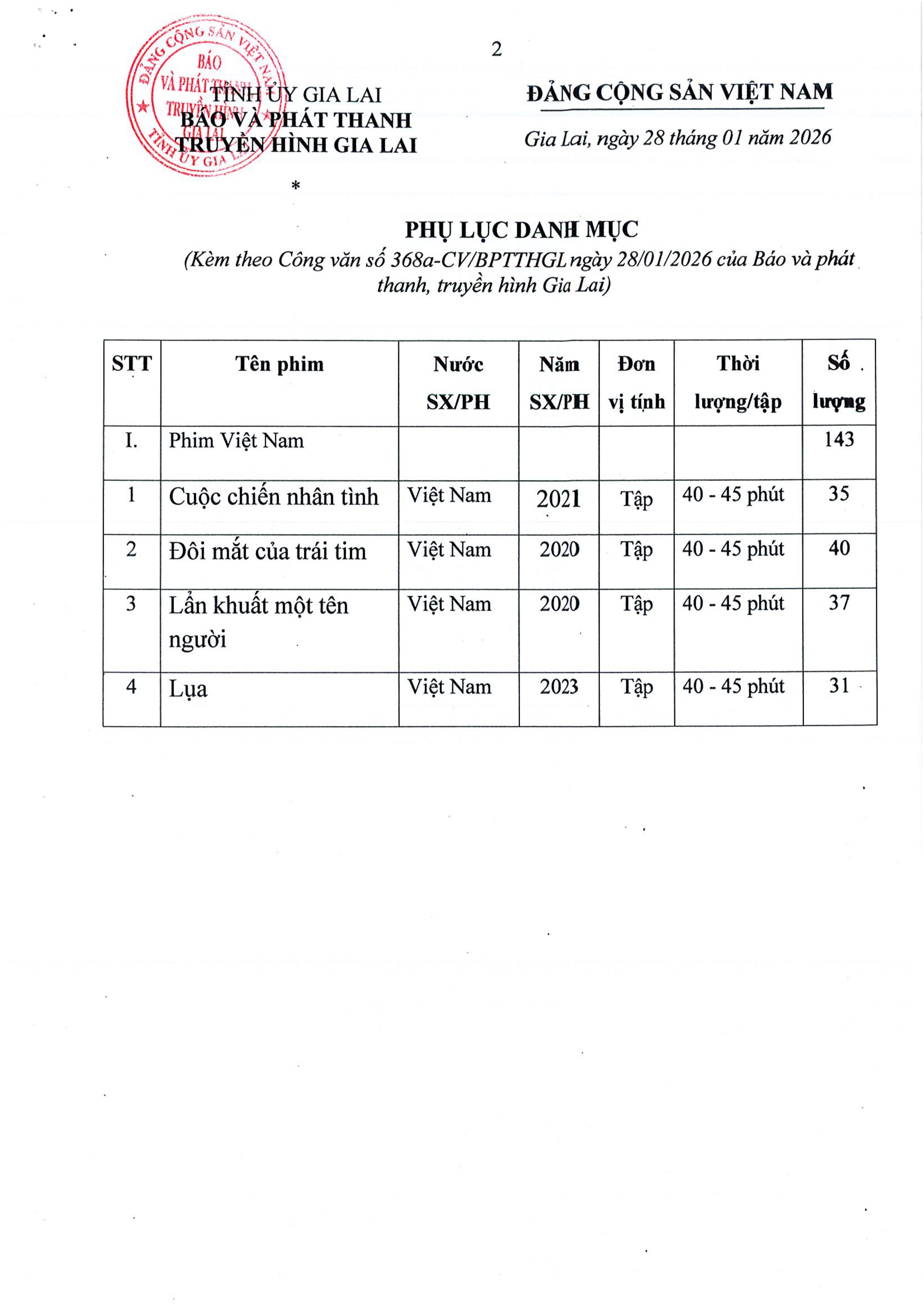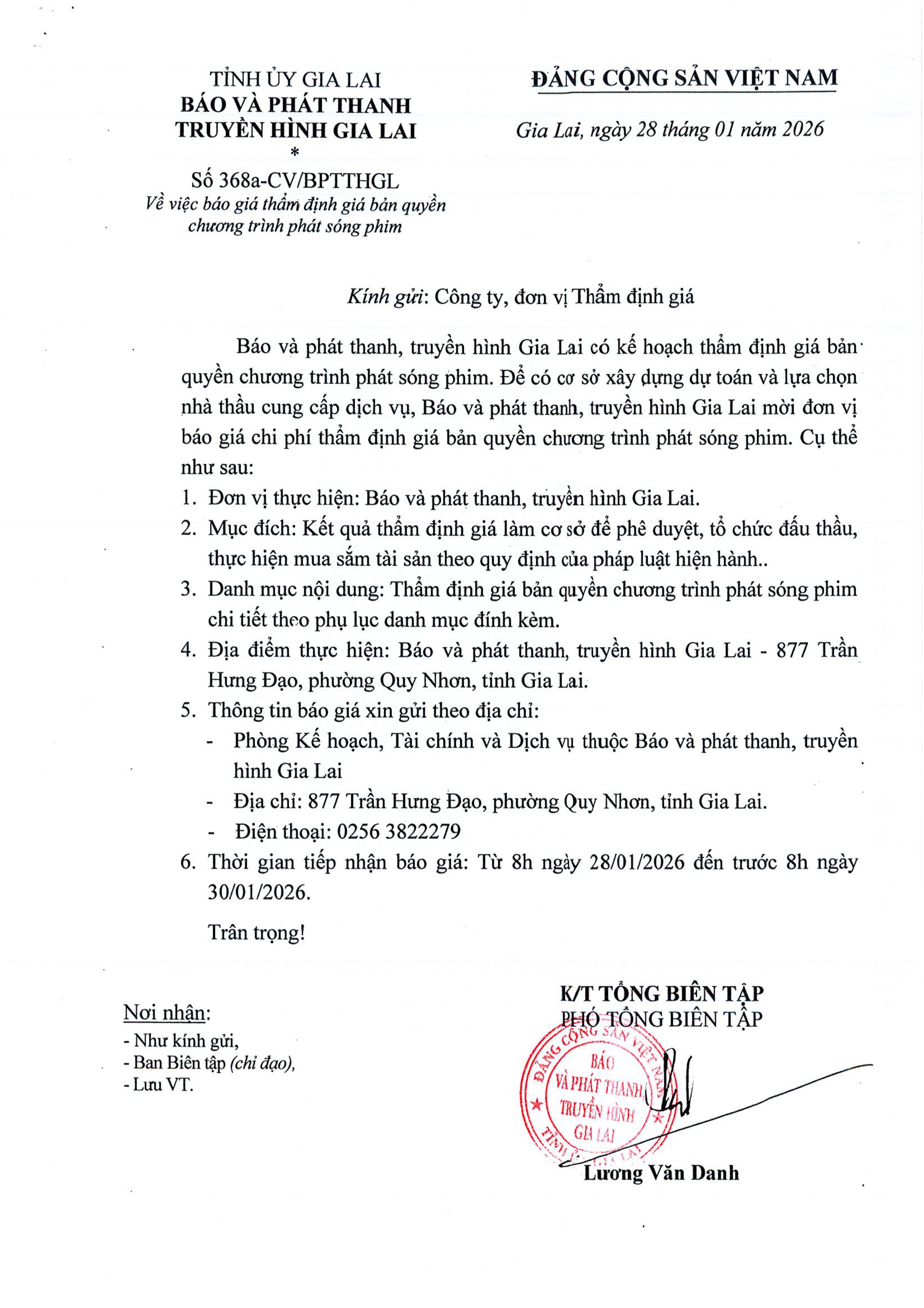 CÔNG VĂN Số 368a – Về việc báo giá thẩm định giá bản quyền chương trình phát sóng phim
