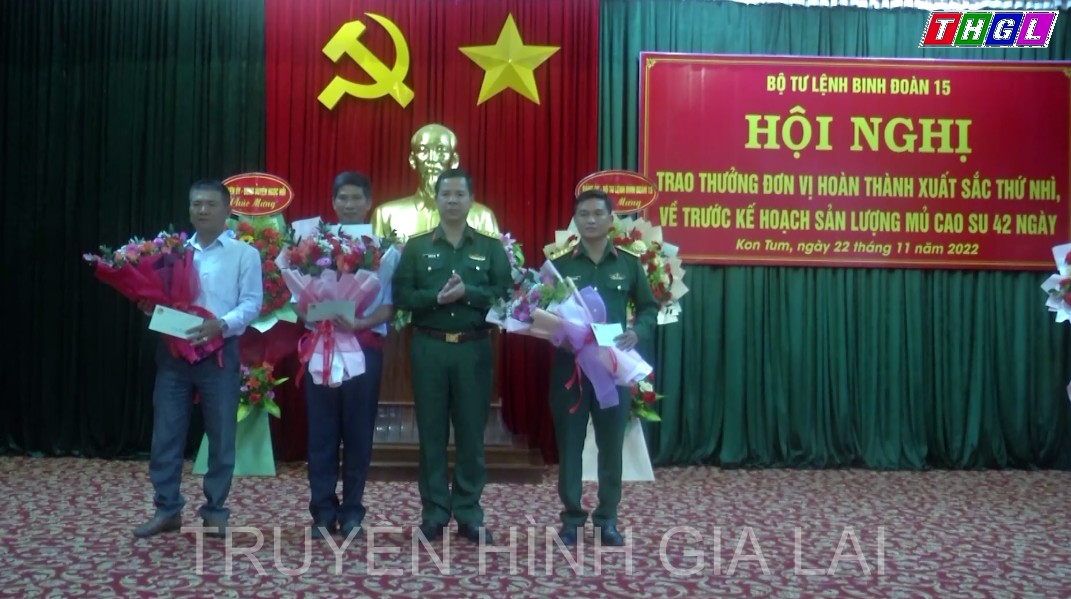 Binh đoàn 15 vừa tổ chức khen thưởng 02 đơn vị trực thuộc là: Công ty 732 và Công ty 75 có thành tích xuất sắc trong thực hiện nhiệm vụ sản xuất, hoàn thành trước kế hoạch sản lượng mủ cao su Binh đoàn giao, về đích thứ Nhì và thứ Ba năm 2022.
