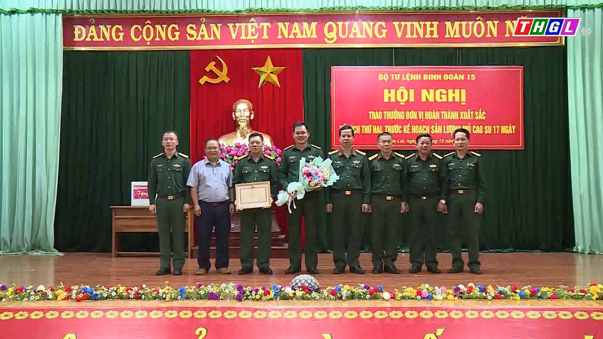 Vừa qua, tại xã Ia Krêl, huyện Đức Cơ, Binh đoàn 15 tổ chức Hội nghị trao Bằng khen và tặng thưởng Chi nhánh Công ty 75, có thành tích xuất sắc, đã hoàn thành kế hoạch sản lượng mủ cao su Binh đoàn giao năm 2023, về đích sớm trước 17 ngày.
