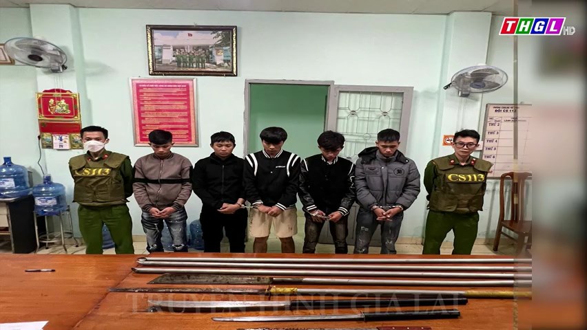 Theo đó, vào khoảng 1h sáng ngày 5.9, khi tuần tra kiểm soát qua khu vực ngã ba đường Vạn Kiếp – Lý Thái Tổ thuộc phường Thống Nhất, thành phố Pleiku thì lực lượng Cảnh sát 113 phát hiện nhóm đối tượng khoảng 10 thanh thiếu niên đang tụ tập và mang theo hung khí. Khi thấy tổ tuần tra, nhóm thanh niên trên liền bỏ chạy. Bằng các biện pháp nghiệp vụ, tổ tuần tra đã tiến hành khống chế, bắt giữ 6 đối tượng gồm: T.V.A (sinh năm 2006) và T.Q.V (sinh năm 2003) cùng trú tại xã Biển Hồ, thành phố Pleiku, T. (sinh năm 2003) và Đ.Q.D (sinh năm 2003) cùng trú tại xã Tân Sơn, thành phố Pleiku, N.N.C (sinh năm 2001) và N.N.K (sinh năm 1993) cùng trú tại phường Yên Thế, thành phố Pleiku; thu giữ 8 dao tự chế, gậy sắt các loại, 1 xe mô tô và 1 xe ô tô.