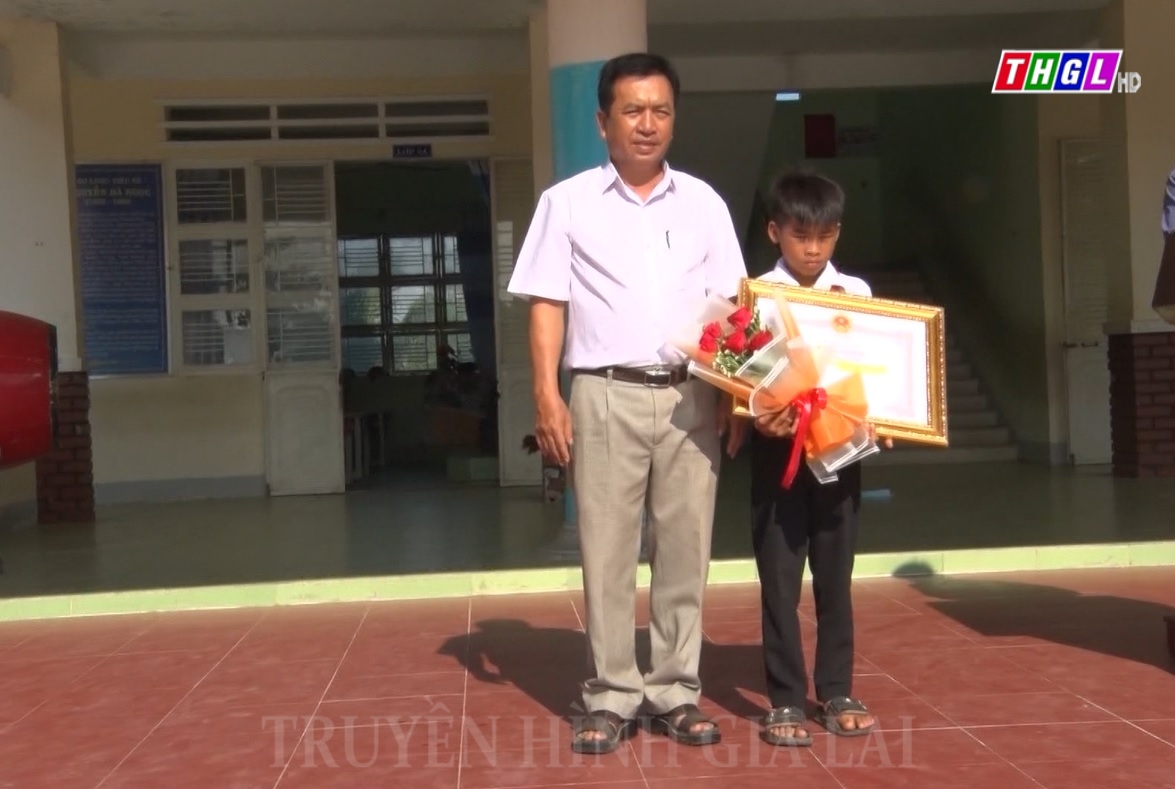 Sáng ngày 24-4, tại Trường Tiểu học Nguyễn Bá Ngọc, xã Kim Tân, huyện Ia Pa, thừa ủy quyền của Chủ tịch UBND tỉnh Gia Lai, đại diện lãnh đạo huyện Ia Pa- ông Ksor Suy – Phó Chủ tịch UBND huyện đã trao Bằng khen của Chủ tịch UBND tỉnh kèm theo 10.000.000 đồng tiền thưởng cho em Kpă Nguyên – Học sinh lớp 4C, Trường Tiểu học Nguyễn Bá Ngọc vì đã có thành tích đột xuất, dũng cảm cứu người bị đuối nước xảy ra ngày 28-3-2023.