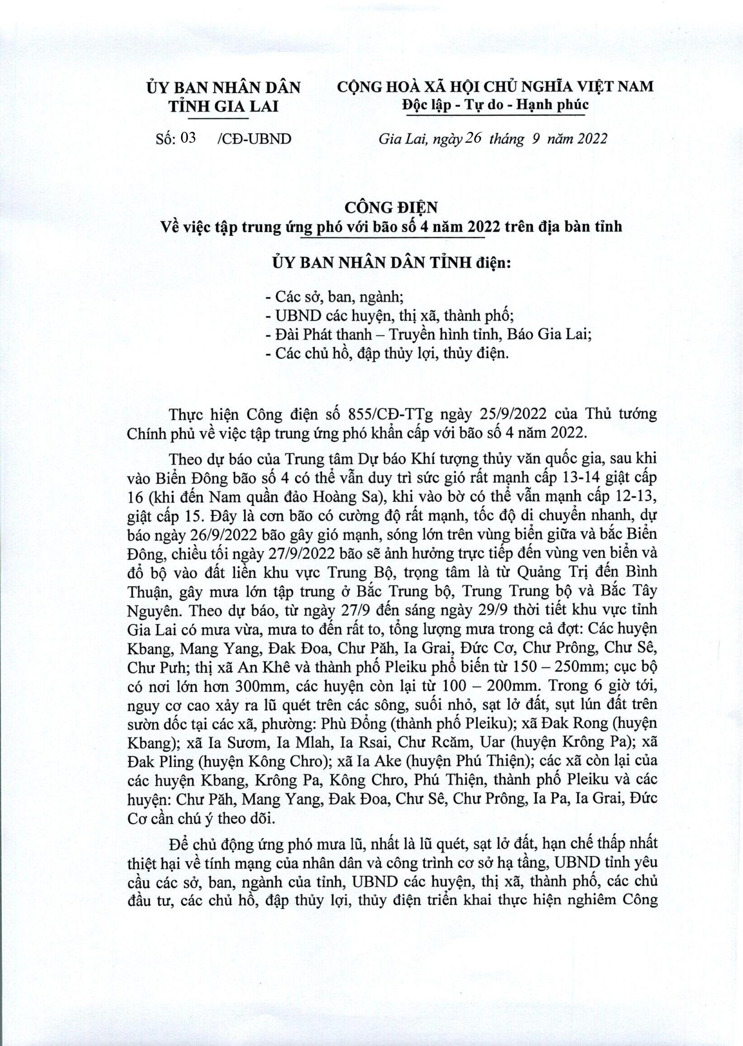 Công điện: Tập trung ứng phó với bão số 4 năm 2022 trên địa bàn tỉnh Gia Lai