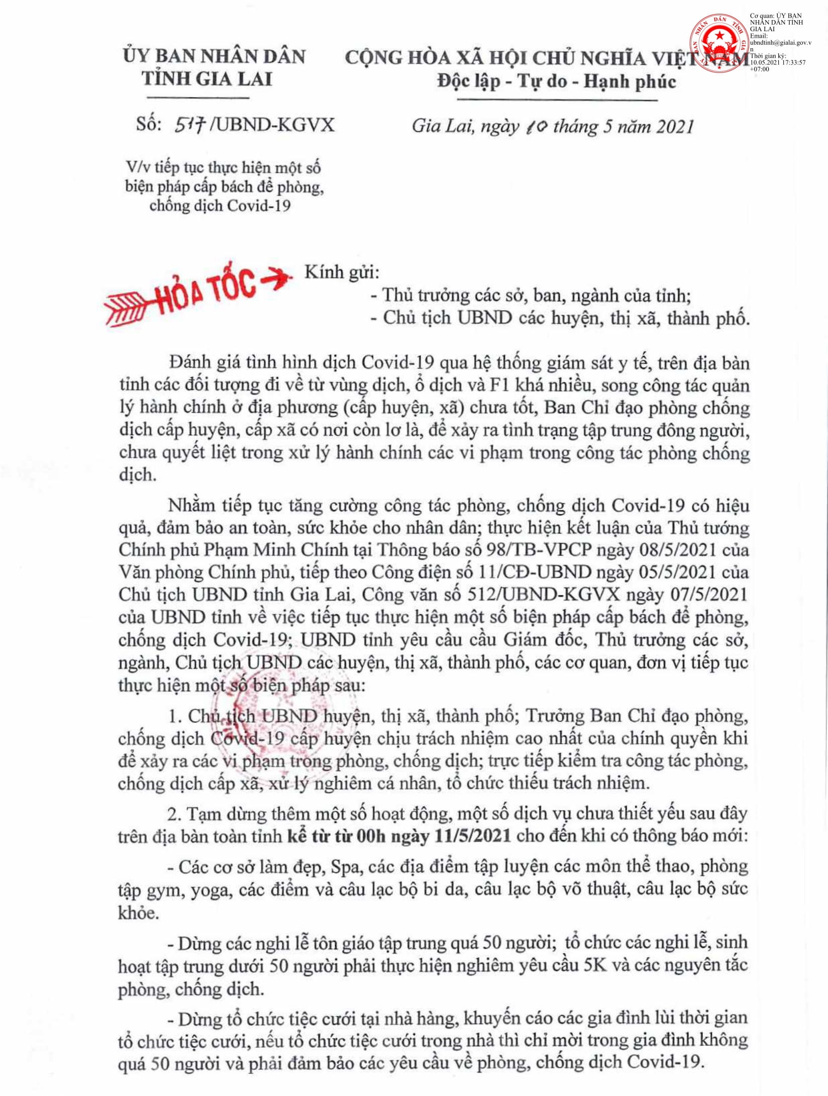 Công văn hoả tốc số 517 của UBND tỉnh Gia Lai về việc tiếp tục thực hiện một số biện pháp cấp bách để phòng, chống dịch Covid-19.