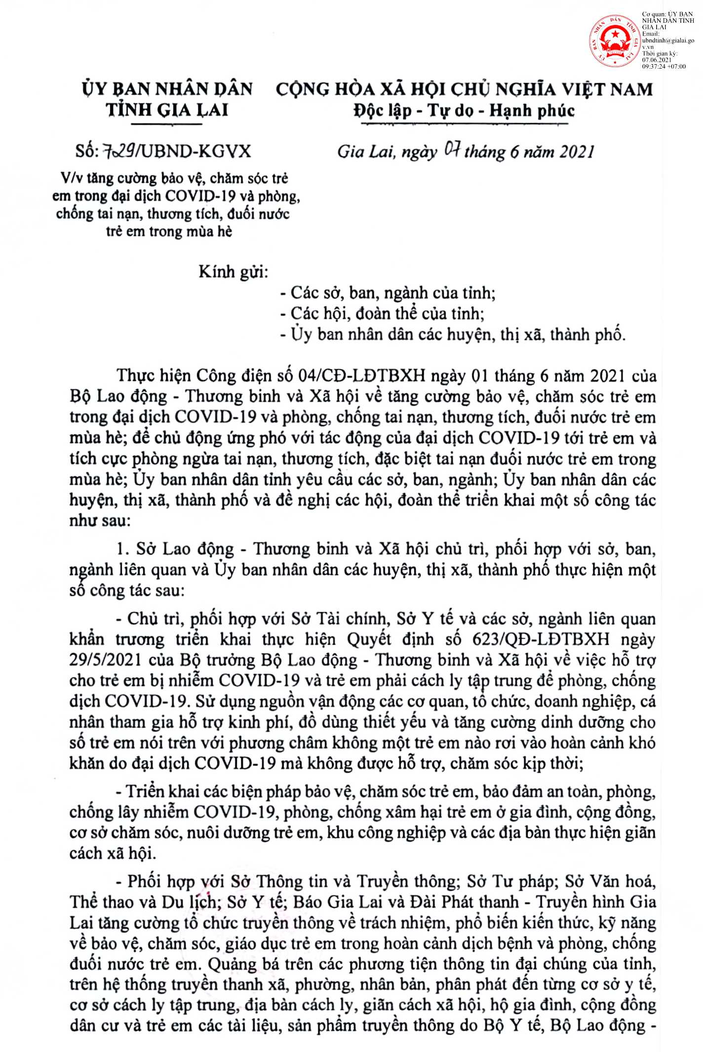 Về việc tăng cường bảo vệ, chăm sóc trẻ em trong đại dịch COVID-19 và phòng, chống tai nạn, thương tích, đuối nước trẻ em trong mùa hè.