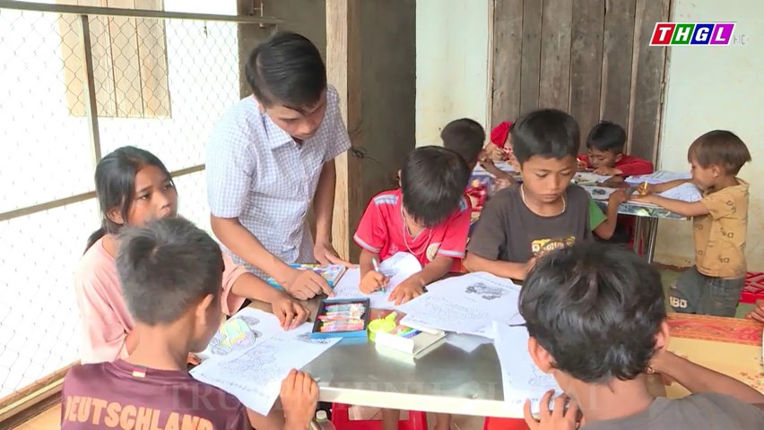 Em Rmah Ly Sa – Làng Chư Bố 2, xã Ia Phang, huyện Chư Pưh bày tỏ: “Ở đây rất là vui, có đông các bạn. Em được đọc sách, được tô màu rất thích.”