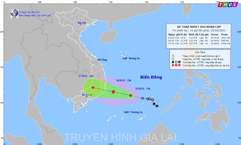 Theo thông tin từ Đài Khí tượng thủy văn khu vực Tây Nguyên: Hồi 13 giờ ngày 25/10, vị trí tâm áp thấp nhiệt đới ở vào khoảng 11,0 độ Vĩ Bắc; 112,8 độ Kinh Đông, cách đảo Song Tử Tây khoảng 180km về phía Tây Tây Nam. Sức gió mạnh nhất vùng gần tâm áp thấp nhiệt đới mạnh cấp 6 (40-50km/giờ), giật cấp 8. Bán kính gió mạnh cấp 6, giật cấp 8 khoảng 80km tính từ tâm áp thấp nhiệt đới.