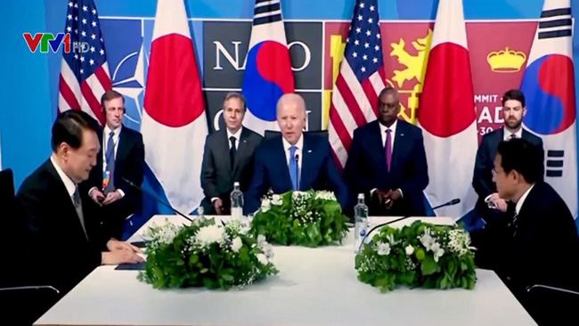 Hôm qua, Tổng thống Mỹ Joe Biden cùng người đồng cấp Hàn Quốc Yoon Suk-yeol và Thủ tướng Nhật Bản Kishida Fumio đã tổ chức cuộc hội đàm ba bên ở Madrid (Tây Ban Nha), bên lề Hội nghị thượng đỉnh Tổ chức Hiệp ước Bắc Đại Tây Dương (NATO).