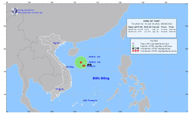 Hồi 1h ngày 08/8, vị trí trung tâm vùng áp thấp ở vào khoảng 15,8-16,8 độ Vĩ Bắc; 111,5-112,5 độ Kinh Đông, trên khu vưc quần đảo Hoàng Sa.