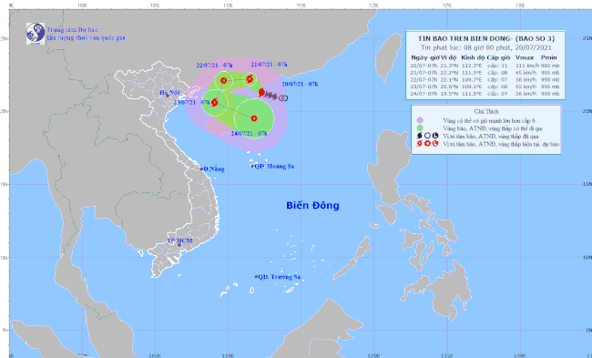 Cụ thể, lúc 7h ngày 20/7, vị trí tâm bão ở khoảng 21,3 độ Vĩ Bắc; 112,3 độ Kinh Đông, ngay trên vùng biển phía Nam của tỉnh Quảng Đông (Trung Quốc). Sức gió mạnh nhất vùng gần tâm bão mạnh cấp 10-11 (90-120km/giờ), giật cấp 13. Bán kính gió mạnh từ cấp 6, giật từ cấp 8 trở lên khoảng 150km tính từ tâm bão; bán kính gió mạnh cấp 10, giật cấp 12 khoảng 50km tính từ tâm bão.