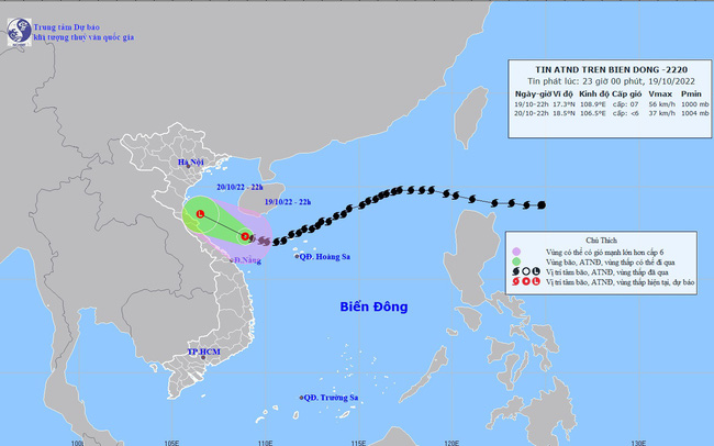 Hồi 22 giờ, vị trí tâm áp thấp nhiệt đới ở vào khoảng 17,3 độ Vĩ Bắc; 108,9 độ Kinh Đông, trên vùng biển Quảng Trị đến Quảng Ngãi. Sức gió mạnh nhất vùng gần tâm áp thấp nhiệt đới mạnh cấp 7 (50-61km/giờ), giật cấp 9, di chuyển theo hướng Tây với tốc độ 10-15km/h.
